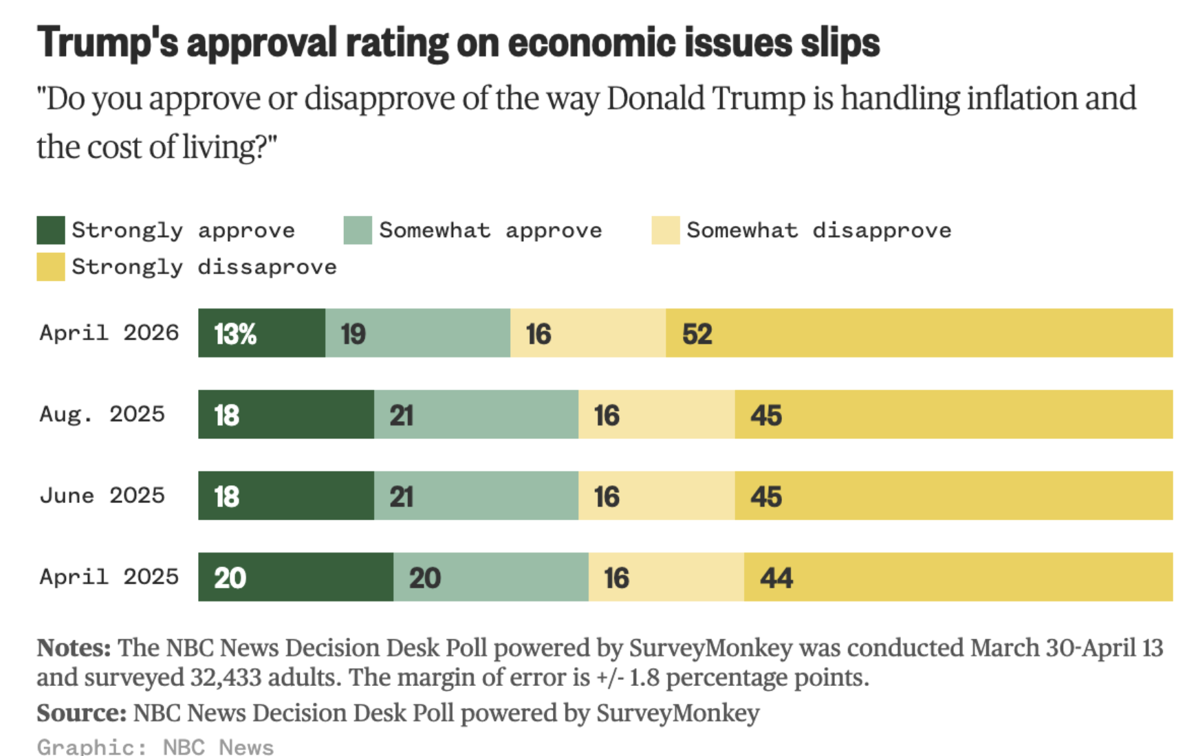 While President Donald Trump’s overall approval rating continues declining, his approval on handling the economy, inflation, and cost of living have also dipped, according to a recent NBC News poll.